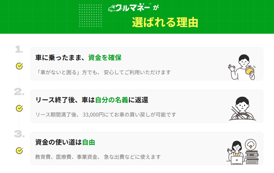 クルマネーは、車を一度売却し、その後リース契約で乗り続けるという新しい資金調達方法です。