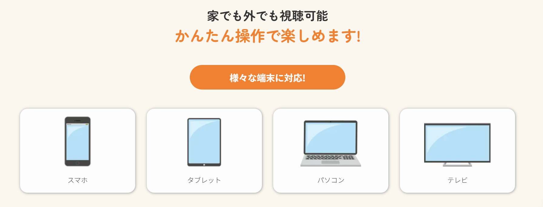 ご自宅にあるスマホ、タブレット、パソコンなど、お好きなデバイスで視聴できます。「操作に自信がない」「うまく見られるか不安…」そんな方も安心!