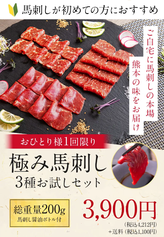 初回限定で「極み馬刺し3種お試しセット(3,900円~)」が登場し、自宅で本場熊本の味を手軽に体験できると人気を集めています。
