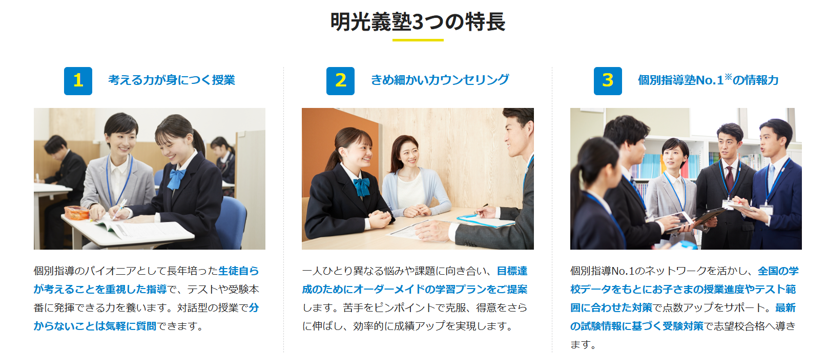 明光義塾は、全国に展開する個別指導専門の学習塾です。創立以来60年以上、地域密着型の教育を続け、今では教室数・生徒数ともに業界トップクラス!