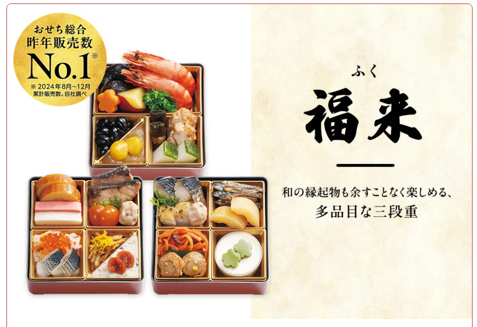 定番のロングセラー商品や、和洋折衷のタイプ、子ども向けに味付けが穏やかな「食べきりサイズ」のセットなど、用途別に選べるのが魅力。特に毎年人気の「福来(ふく)」などは和の縁起物を余すことなく楽しめる多品目な三段重として高評価を得ています。